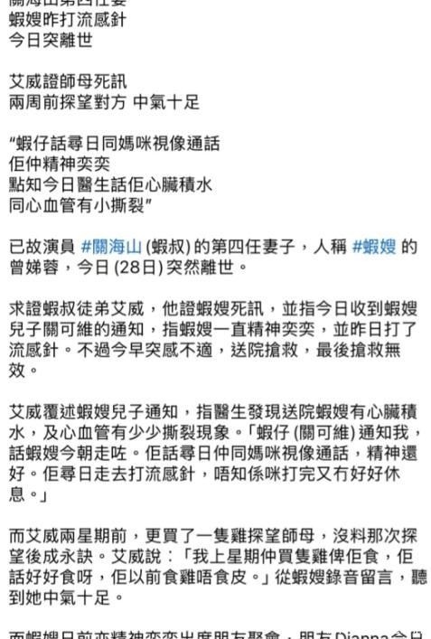 14. 连关海山的徒弟都表示难以置信,前两周还亲自登门探望过“虾嫂”,没想到转眼之间便天人永隔。
